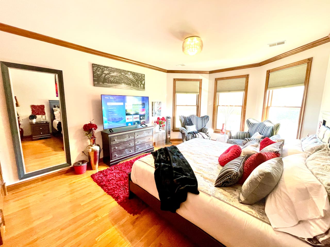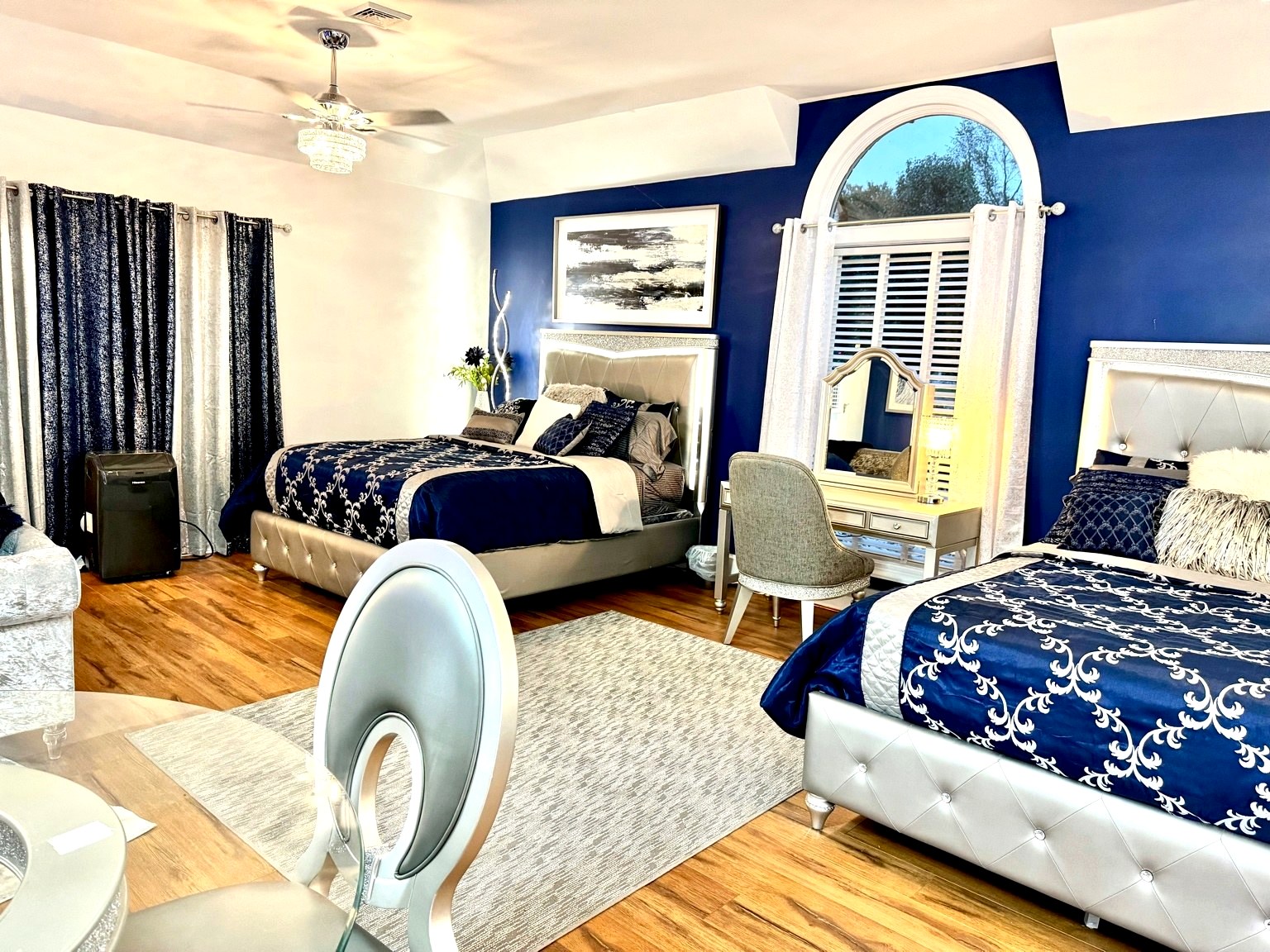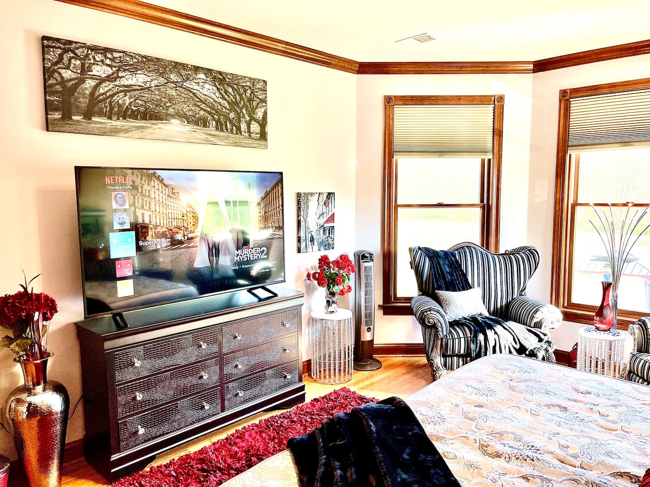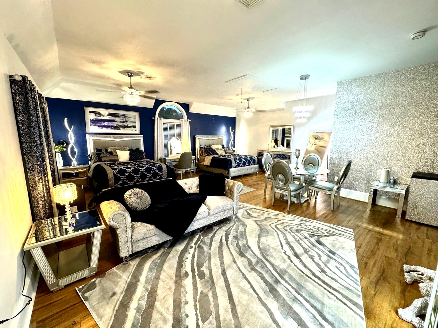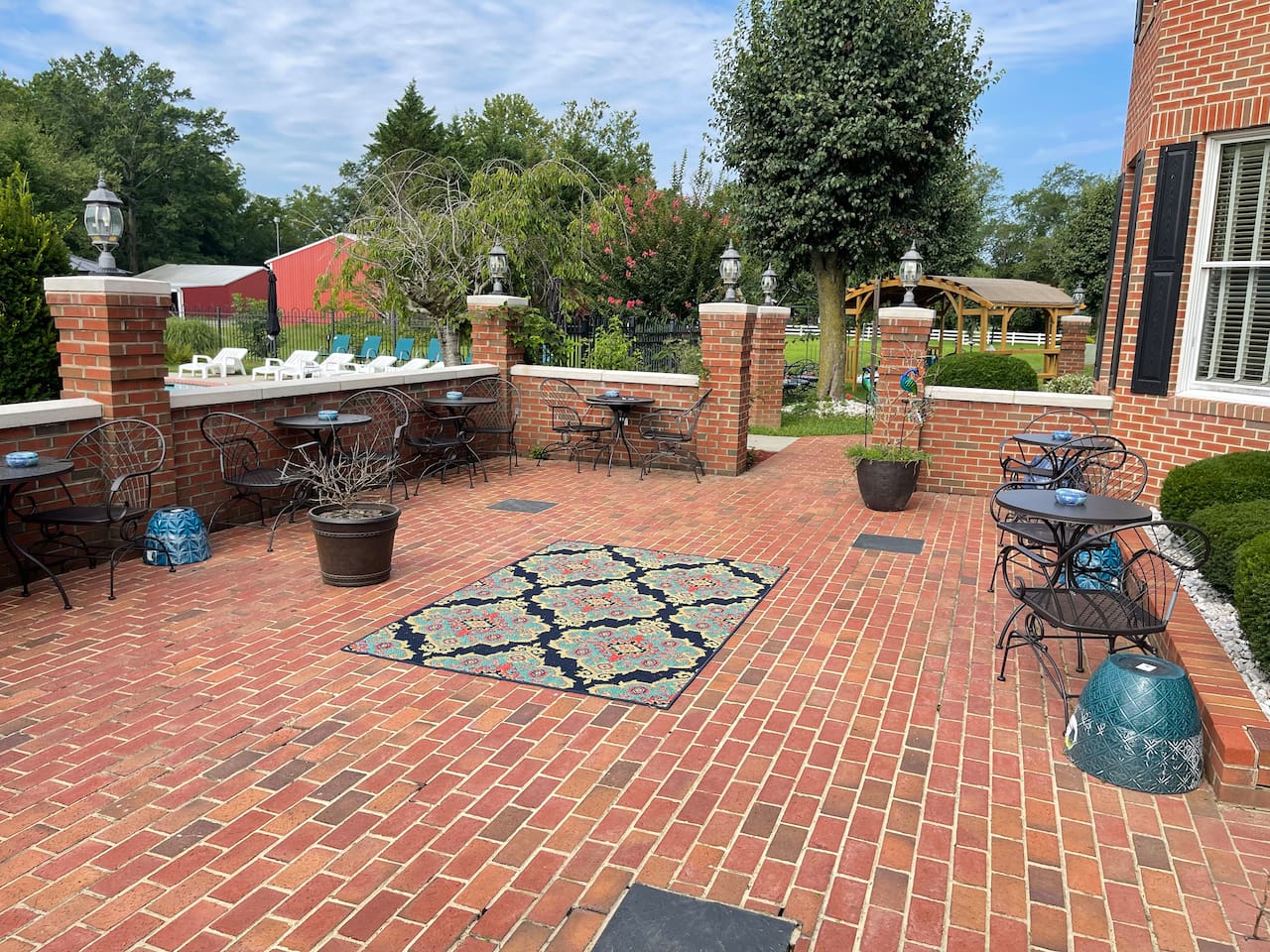 This unique farmstay on a 20-acre working farm features use of an all brick Victorian-style home that includes six bedrooms and four bathrooms that accommodate plenty of guests comfortably with a great deal of privacy. Guests will share the 20-acre farm resort grounds with other visitors and staff but will have exclusive use of the home, pool, and patio are included with this booking. If you are interested in exclusive use of the entire resort, please inquire. All beds are king or queen beds. Enjoy modern amenities including TV, wifi and ethernet internet, a business center. There is a dining room with a huge table that seats 10 people. The home boasts a modern chic feel contrasted with a rustic flavor that makes for a very unique interior design experience. You’ll easily forget you are staying on a farm because we spared no expense in making the decor very interesting. We have a salt water inground pool and attached whirlpool open 24/7 from mid-May to September (weather permitting). The pool area features two large cabanas and furnishing.. The pool area has plenty of lounge chairs and pool toys. Don’t be surprised if an alpaca walks up to the pool fence to check on you. We designed our pasture area to circle the home so that guests can enjoy views of them through the windows. It’s pure bliss seeing them. The home is wonderful but it is actually the least awesome feature of our farmstay. What everyone loves most about this farm are the animals, outdoor area, and the rural peaceful vibe. Locals and tourists alike adore this property as it has such a unique and beautiful layout. The visual beauty of the property is not where the experience ends. Wait until you meet our herd of alpacas, mini-cow, mini-donkeys, emus, bunnies, exotic breed chickens, ducks, geese, wild birds, and a livestock guardian dog. Animal lovers won’t want to leave. You can book a formal farm tour to hear the story of how Charity’s Hope Family Farm came to be. Every animal has a story as most of them were rescues. Our family has a story. This area is rich in history. More importantly, the area has a bright future as new people discover the joys of new-age farming and welcome the much-needed innovation in the agricultural industry called agritourism. Book this home to create lasting memories with your friends, family, colleagues, or organization. You won’t regret it.